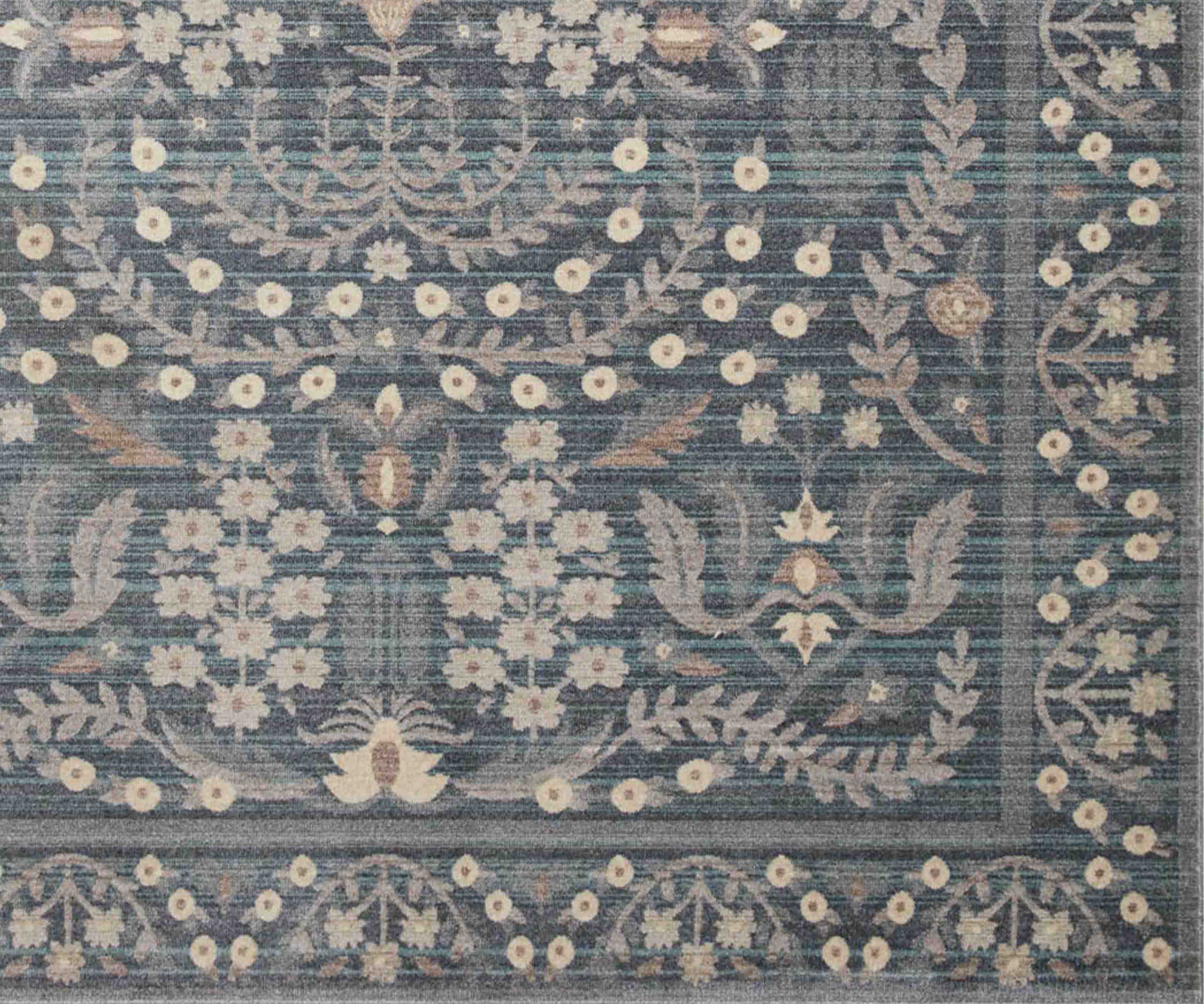 We bought this rug in the blue. It's absolutely beautiful. It's much more blue than gray/blue in person and the flowers are a brighter cream. Our house has lots blue and cream so this rug fits the bill. The pile is low and very soft. It's perfect under dining chairs because chairs won't catch on the rug.