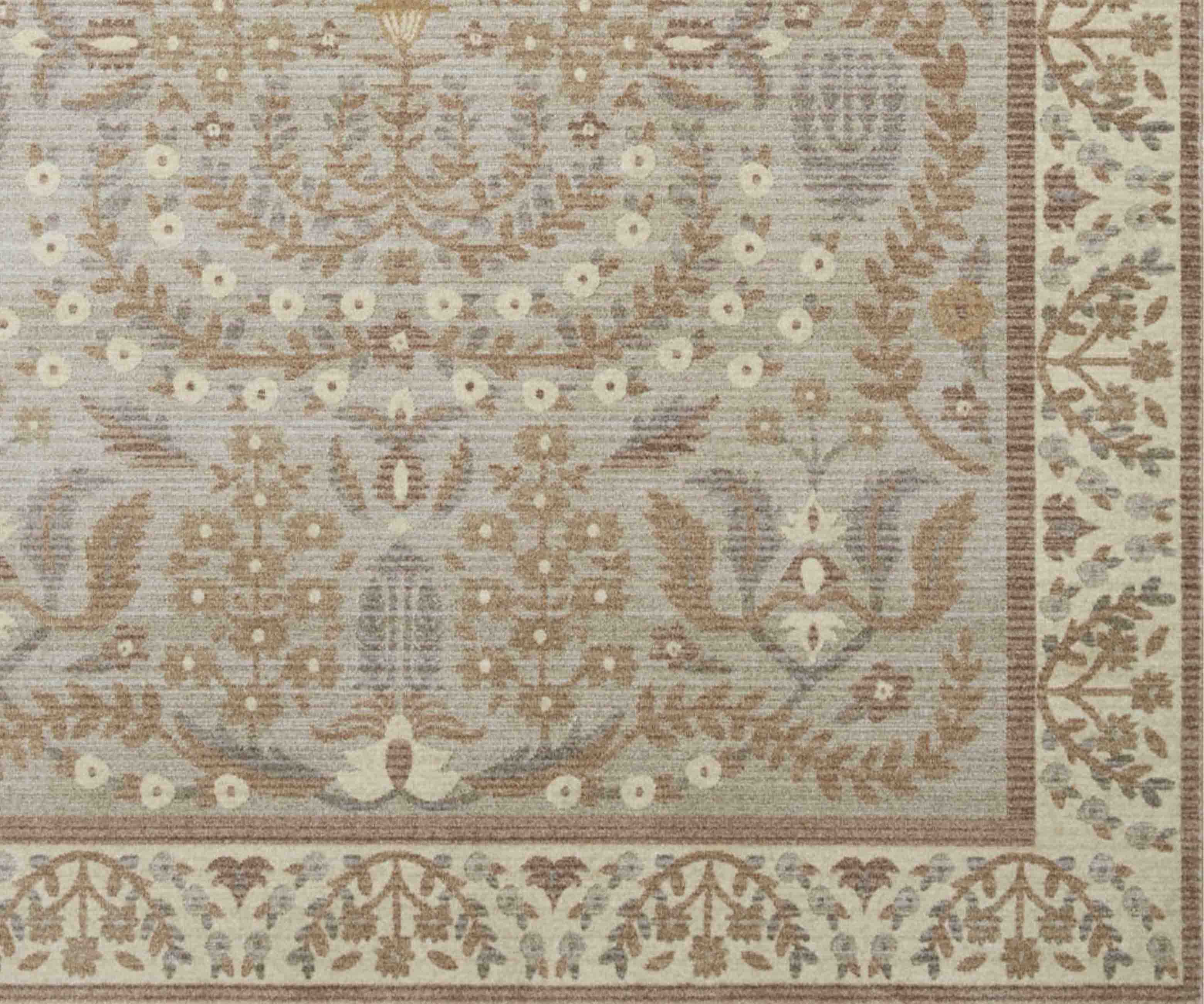 We bought this rug in the blue. It's absolutely beautiful. It's much more blue than gray/blue in person and the flowers are a brighter cream. Our house has lots blue and cream so this rug fits the bill. The pile is low and very soft. It's perfect under dining chairs because chairs won't catch on the rug.