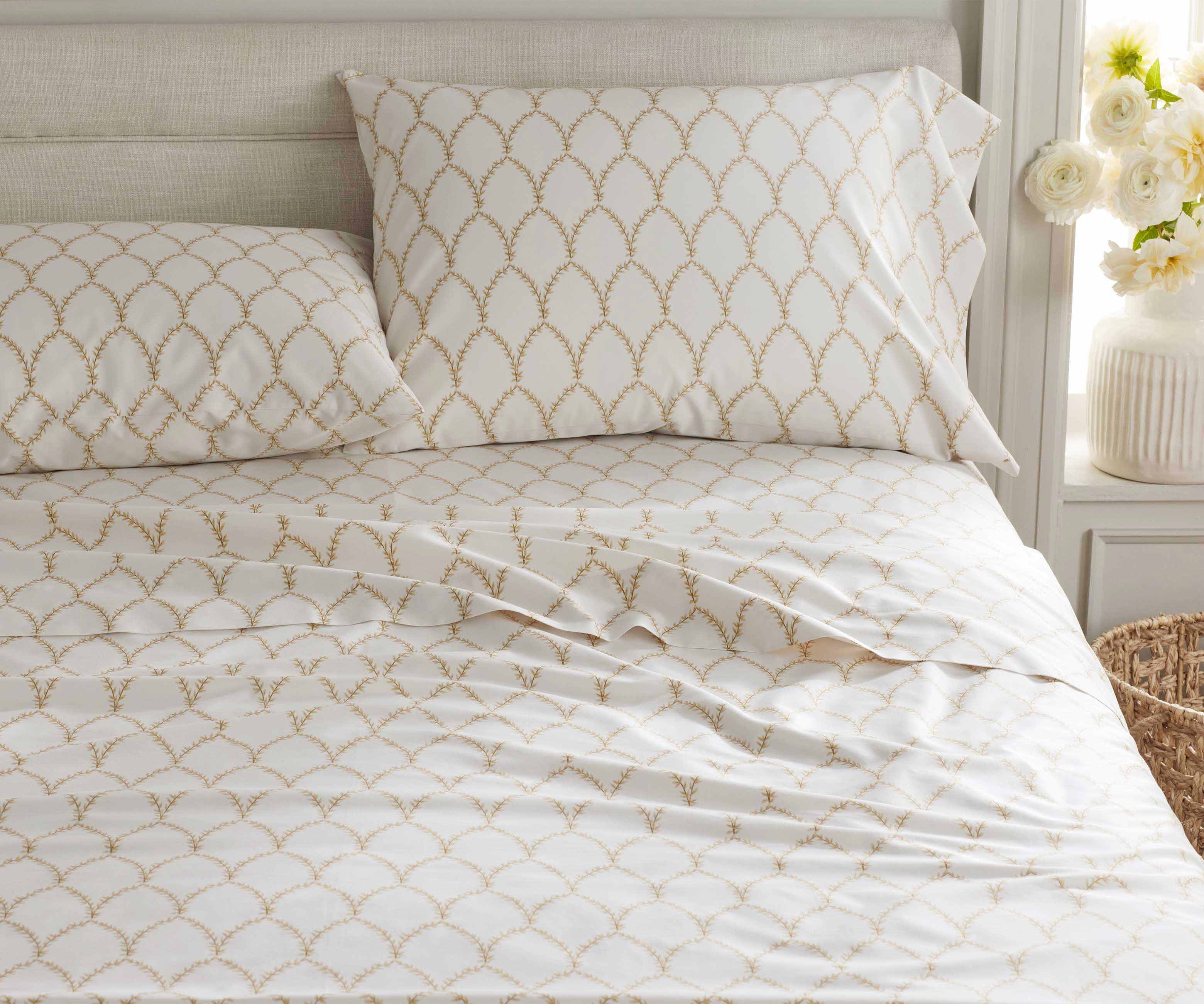 Filigree leaves create a crosshatch grid filled with botanicals on our Estee Garden bedding, a design that's both classic and feminine.