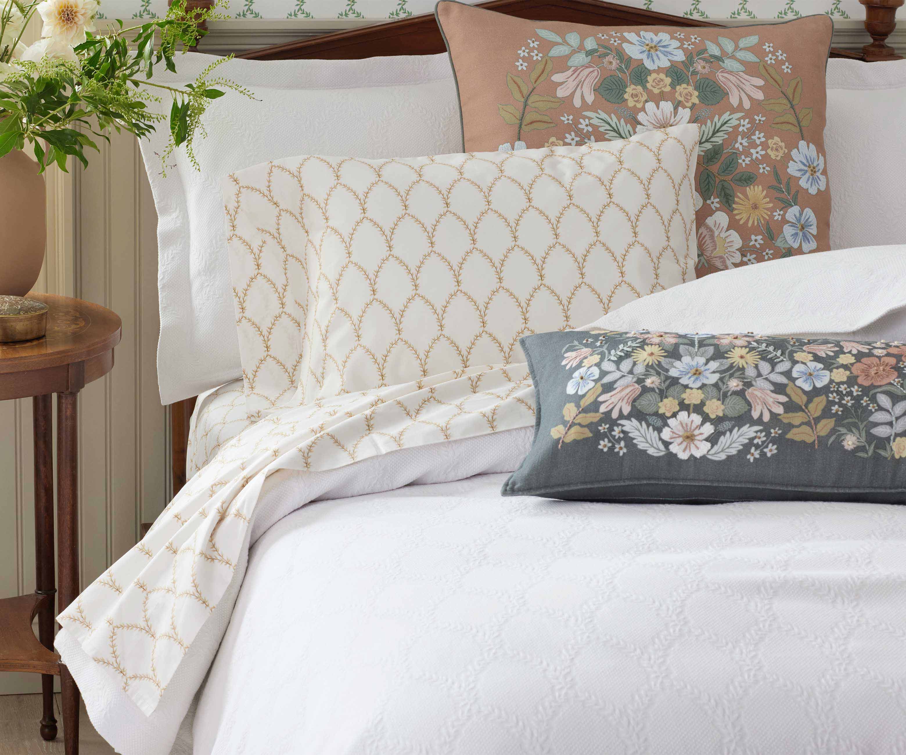Helena’s folksy florals and garden-inspired details blooms throughout this new bedding collection, all the more charming when paired with new Amelia sheets and pillowcases.